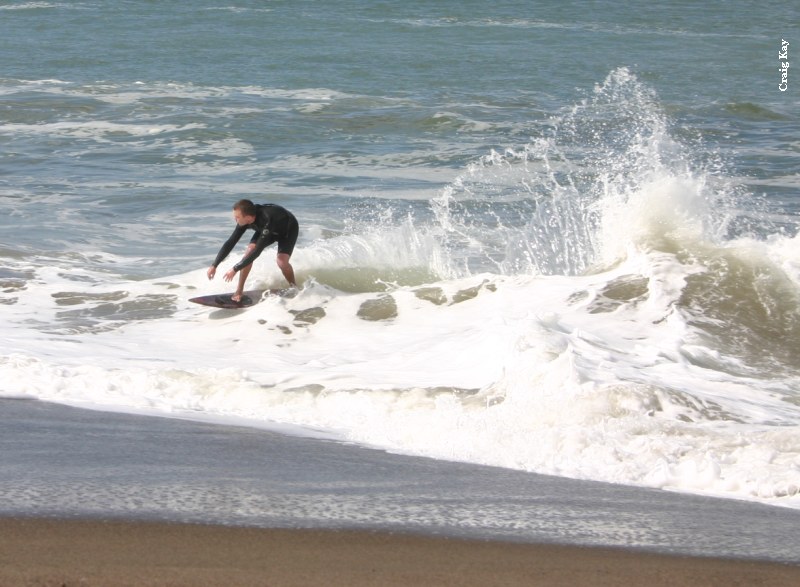 Josh decided to start checking for greener pastures towards the north end and we decided to follow after seeing him go for a couple. The beach looked steeper, and the waves a little more onshore. It was ok a little north of the parking lot when Heins comes running by, suited up, and rambling about the sider at the very north end. Like lemmings we all followed. The sider wasn’t great, but the beach was very steep at the north end and everyone started getting good rides. 57 hooked up on one 2 points down from the end that was very memorable as he planed out far, hit one backside, and rode it for a mile towards the north end. The beach erupted. We skimmed for a long time down there in the sun, with no dub, and everyone getting good rides like Paul who got more barrels than I could count.