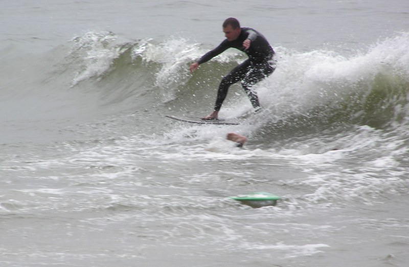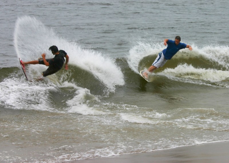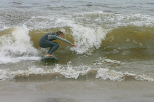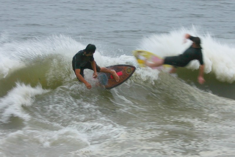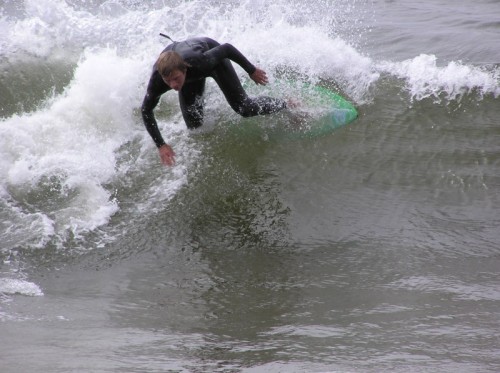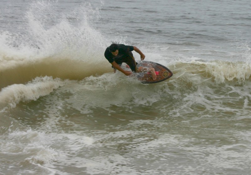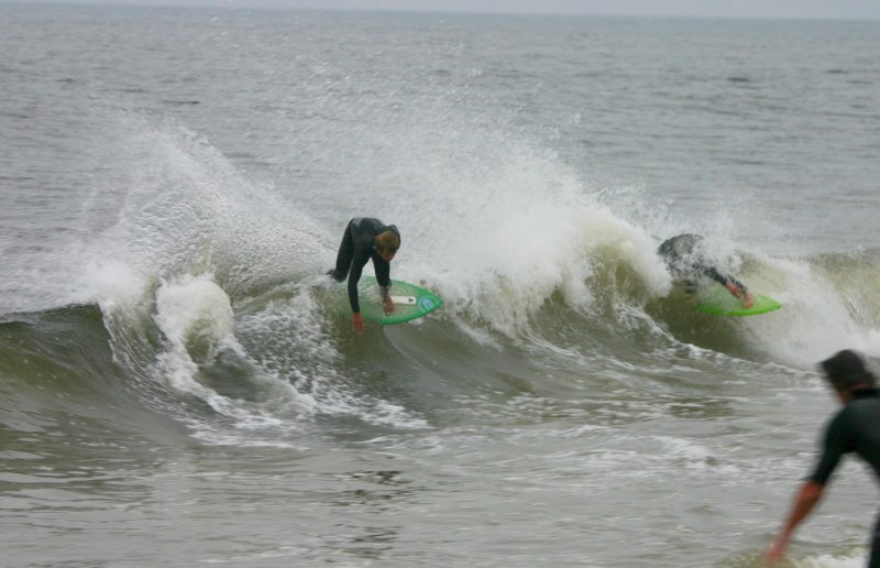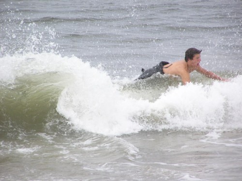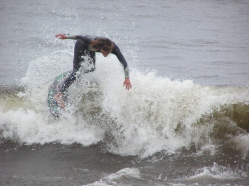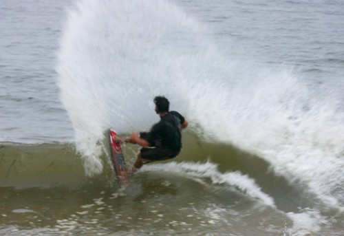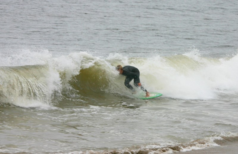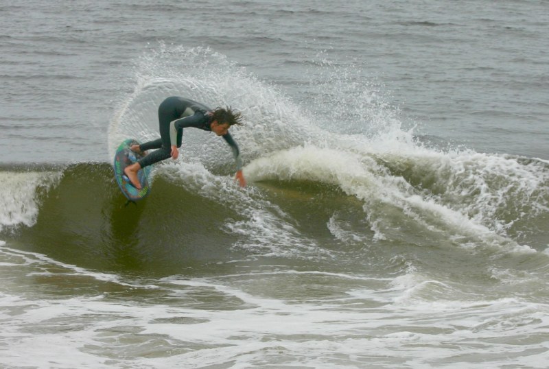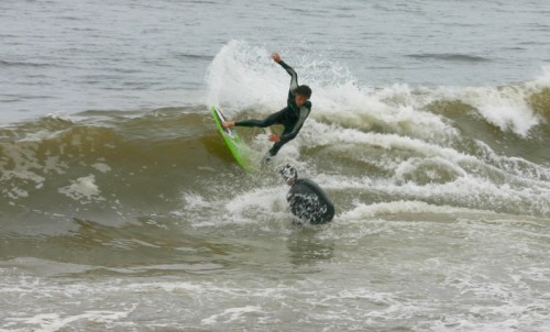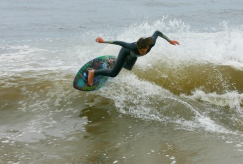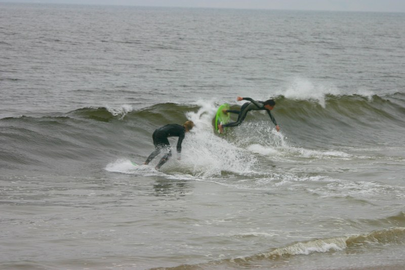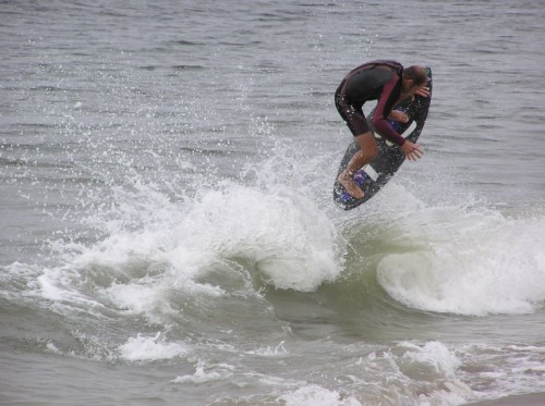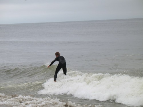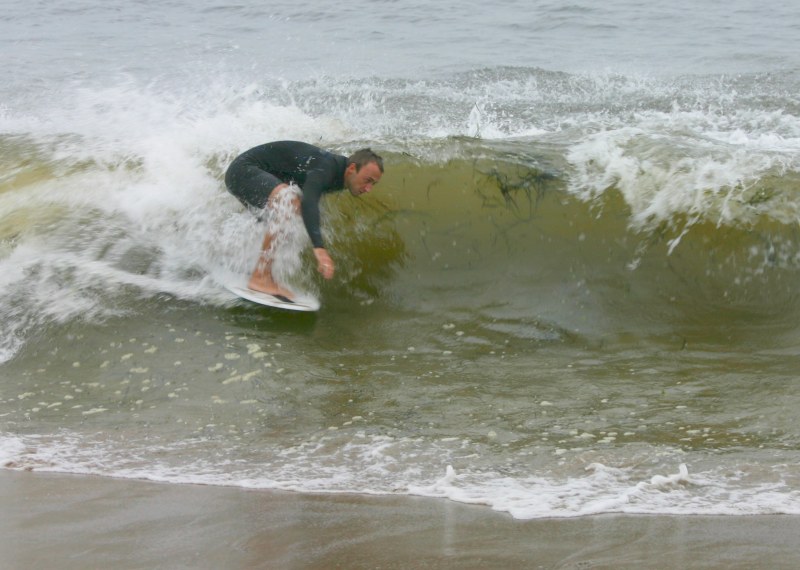 Saturday morning I arrived around 9 to find the Fenster finishing his fishing expedition, empty handed which was weird because on Wednesday the fish were going nuts. In any event, Deebo had already arrived, suited, and was skimming about a mile down the beach. Directly in front it looked low-ish and weak – but not awful. Josh, Daver, Efrin, Neddy Bumbo, & Will arrived and we decided to get in. We headed down to where Deebo was skimming earlier and scored the better waves of the day. The beach was much higher and steeper down at the east end and we were soon joined by 57, Ozzy, and a multitude of others. A good fun session was had down there till about noon when the tide started to drop and the dub kicked up enough to make it sloppy.