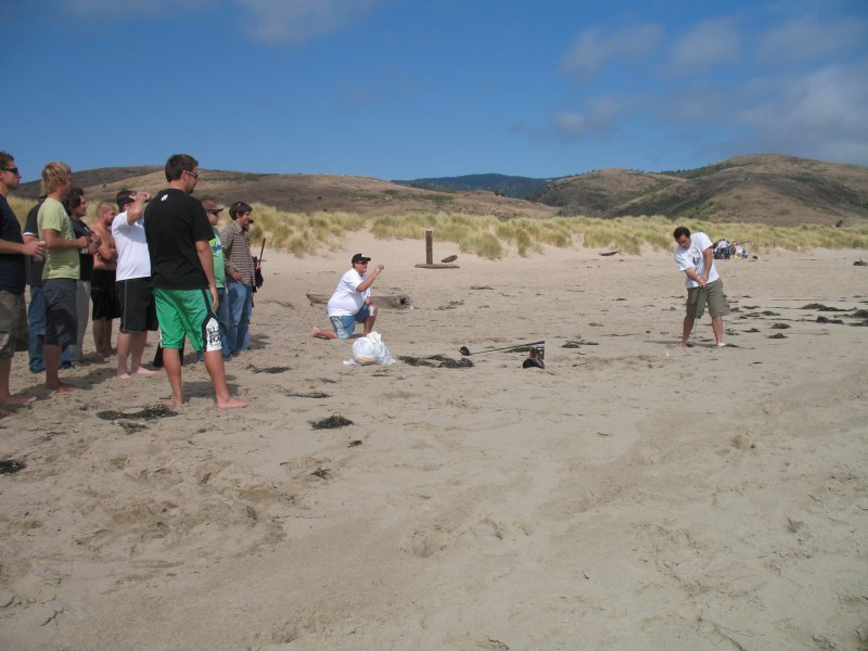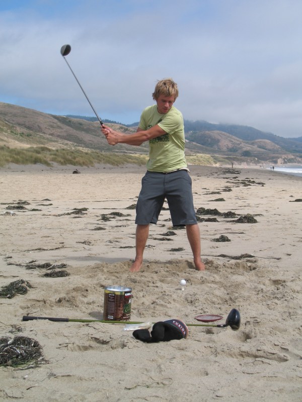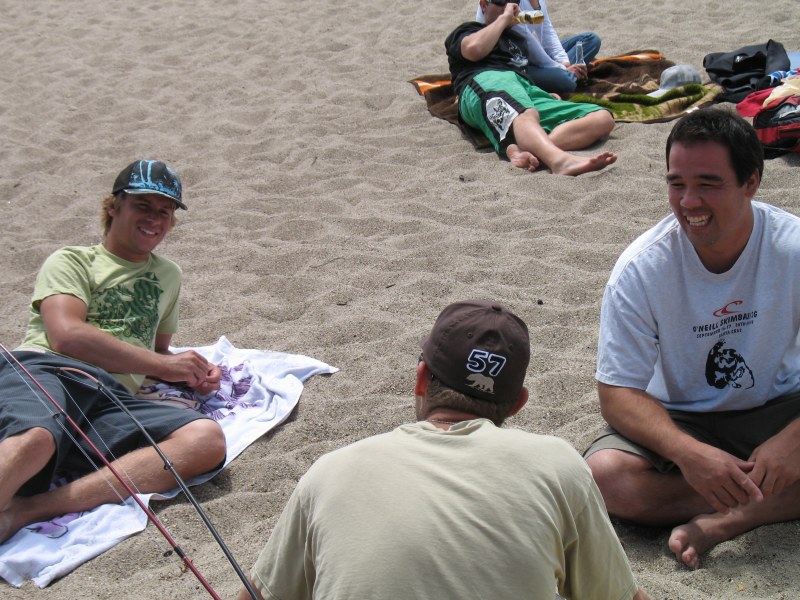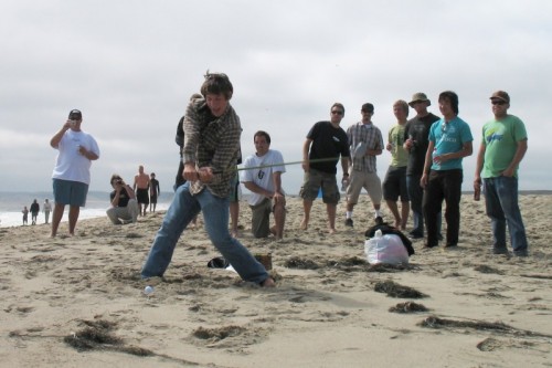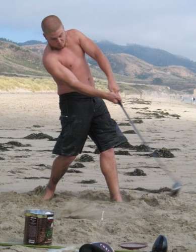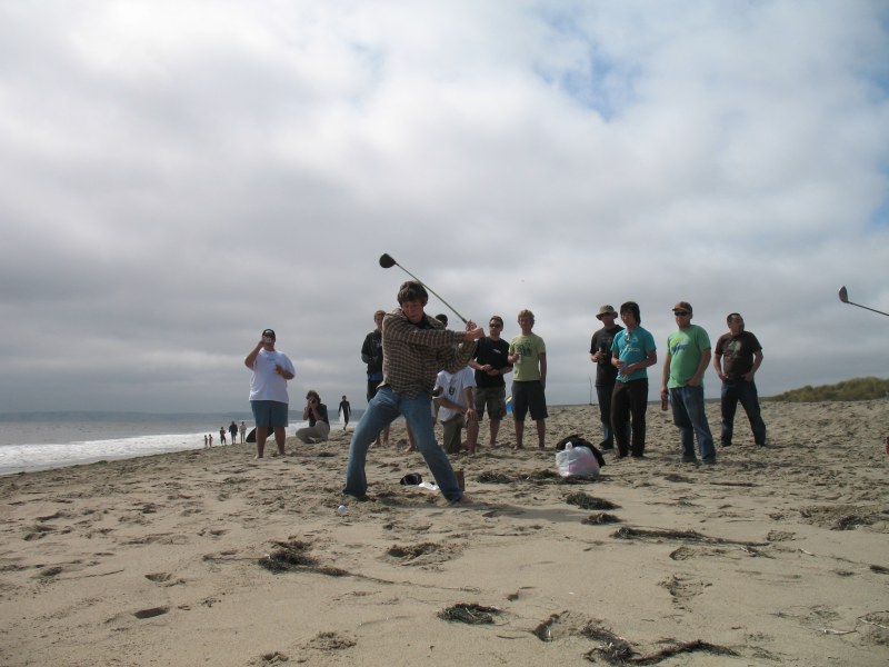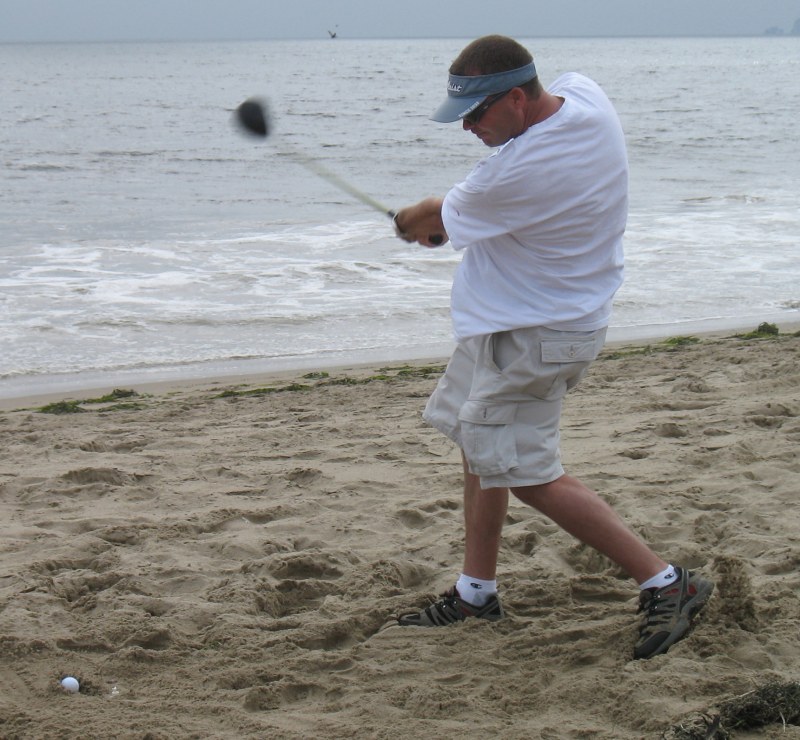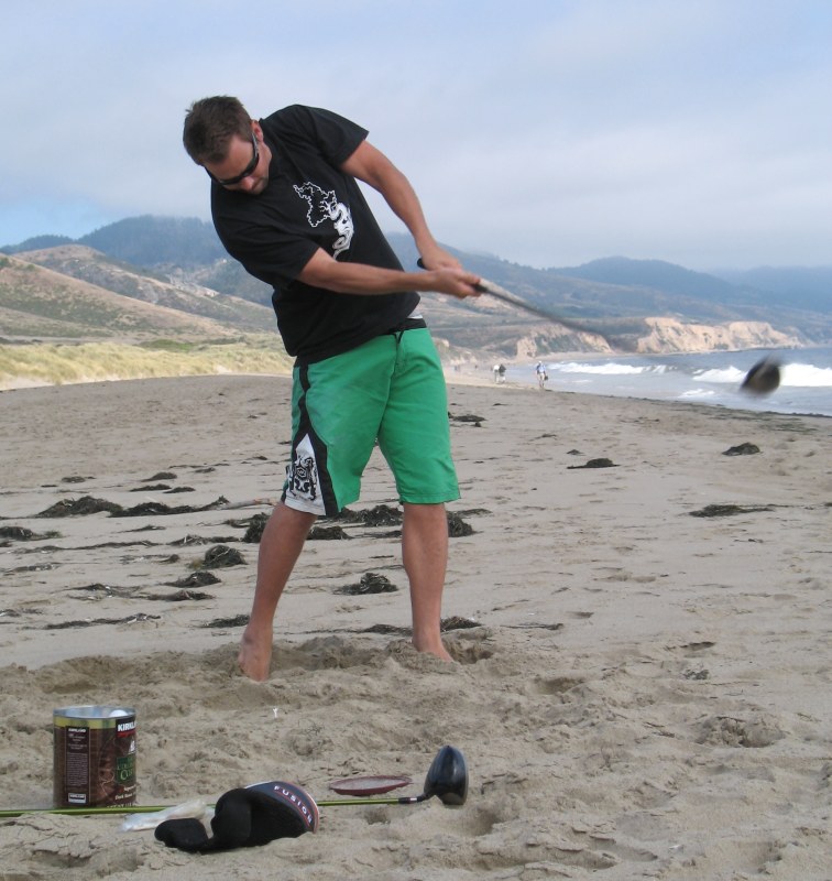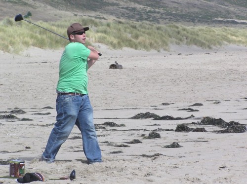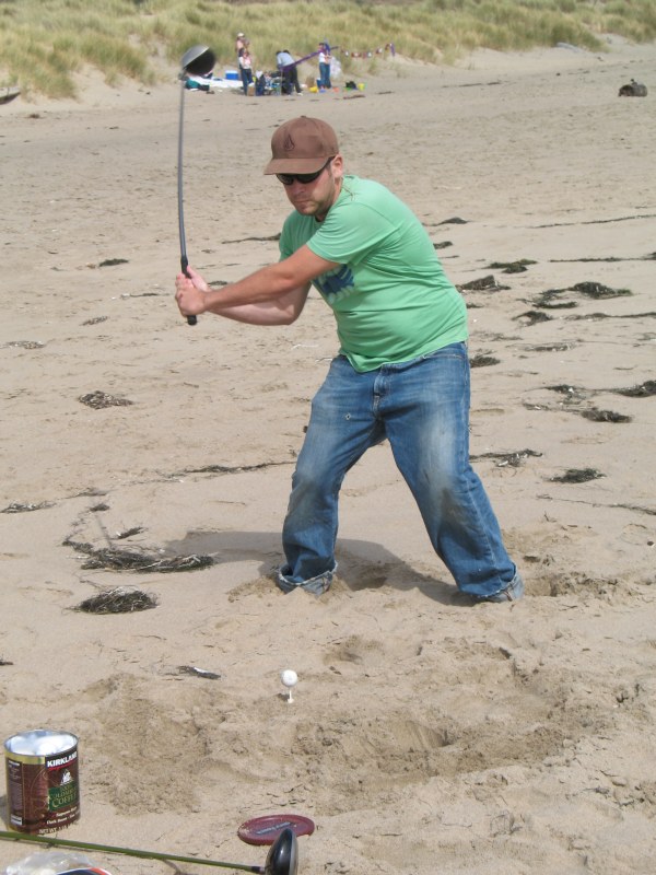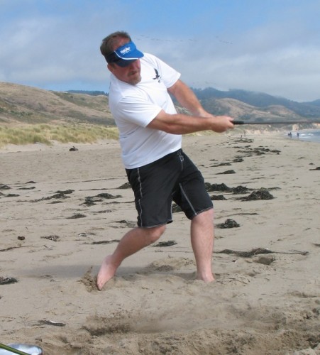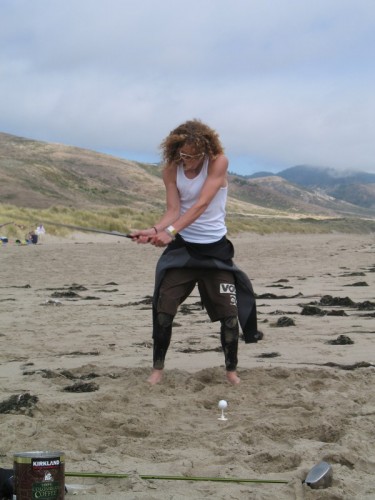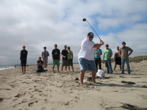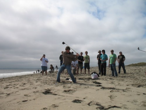 The usual afternoon activities then began as more people started to arrive and wait for the tide to come back in which was scheduled for 8:20. We hoped to start the event (this is not a contest) around 6:00. In the meantime, we held the long drive contest and everyone got involved. Fenster started it off with a bomb, but he took himself out of the running to judge, though he would have easily won the event in all likelihood. Many of the skimmers had trouble with this sport and it was fun to see all the whiffs. Making it to the finals with some solid bombs were Ben Hagar, Dad (aka DAK), Patrick (Manchild), Tom (Ozzy) & Daver with Manchild taking top honors (we think! – it’s kind of a blur) and a