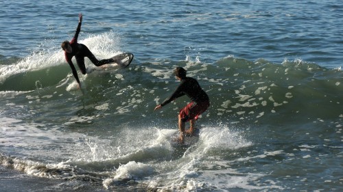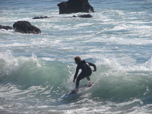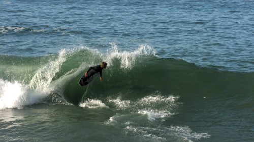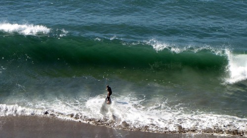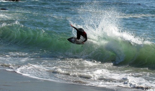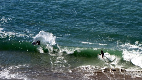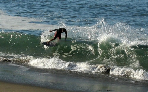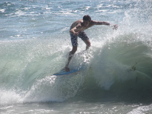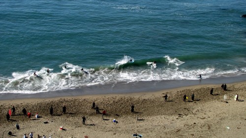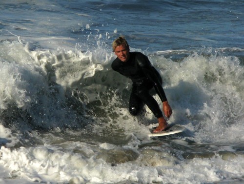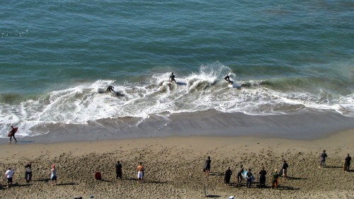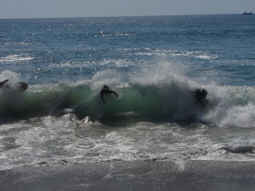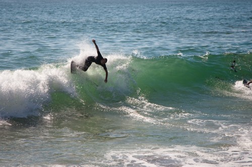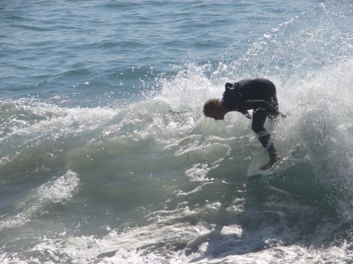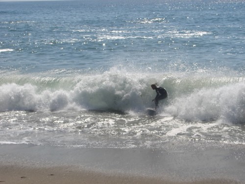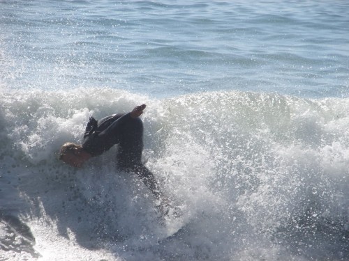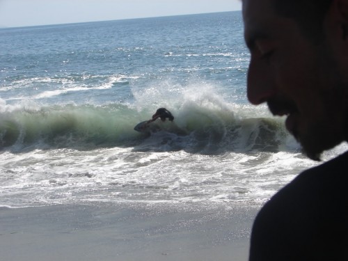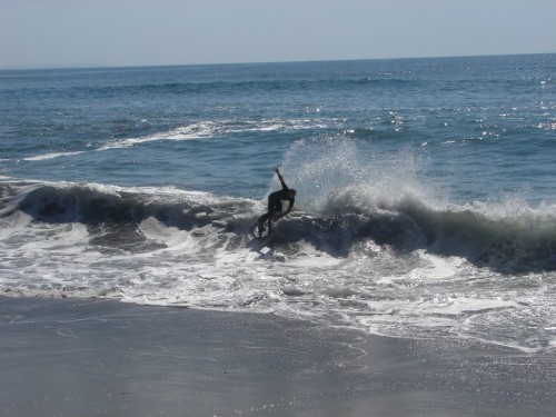 Hiking over the rocks we saw 4 or 5 guys already in the water, among them Kelly, _4255, and VD, already tearing up the glassy onshore conditions. A number of other people were milling about, such as Kevin and Deebo who had also camped down on the beach that night. I decided to snap a couple pics and then couldn’t hold out anymore and had to get in the water. Over the next hour the beach filled up with a steady stream of people. Suddenly The Cove started to look tiny. Luckily, the whole cove was breaking. As Deebo noted, The Cove often has just one side working, but today it was breaking of both ends with peeling wrap coming in for both sides. There were essentially 2 sand peaks on the beach, and by natural order, most of the reggy footers went to the right peak and the goofys to the left with a pretty even spread. There were probably 20 guys on each peak, with sick waves being had at the same time on both. Simultaneous board claps from both sides were often heard and collisions were nearly missed (and sometimes not) when skimmers from each peak went frontside into each other.