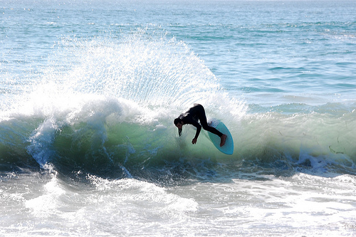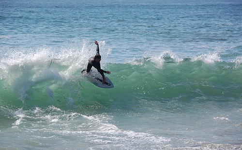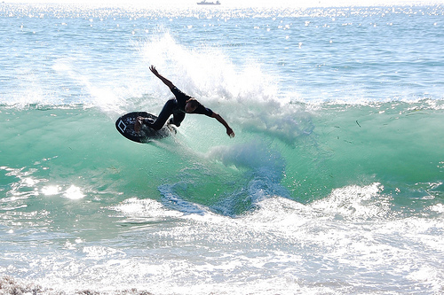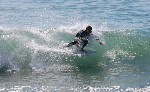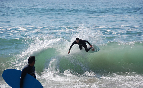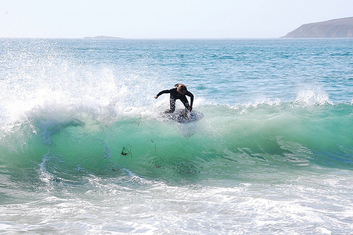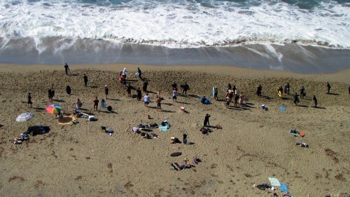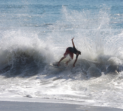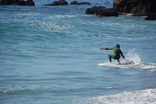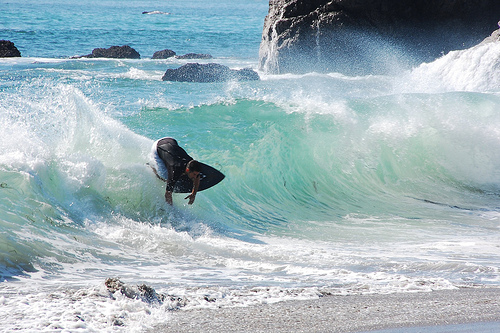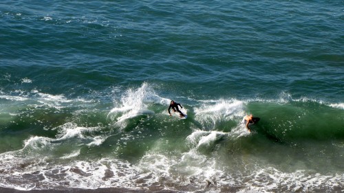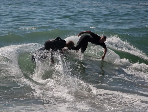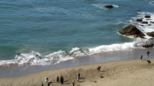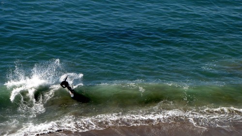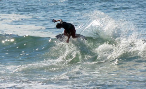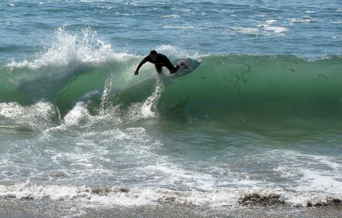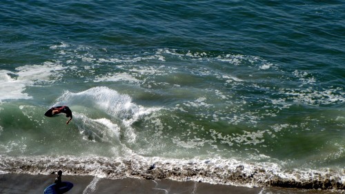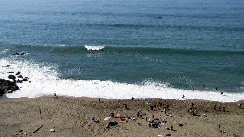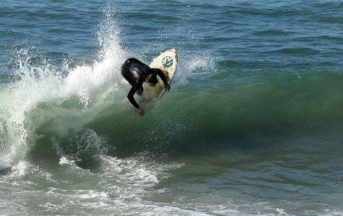 Hiking over the rocks we saw 4 or 5 guys already in the water, among them Kelly, _4255, and VD, already tearing up the glassy onshore conditions. A number of other people were milling about, such as Kevin and Deebo who had also camped down on the beach that night. I decided to snap a couple pics and then couldn’t hold out anymore and had to get in the water. Over the next hour the beach filled up with a steady stream of people. Suddenly The Cove started to look tiny. Luckily, the whole cove was breaking. As Deebo noted, The Cove often has just one side working, but today it was breaking of both ends with peeling wrap coming in for both sides. There were essentially 2 sand peaks on the beach, and by natural order, most of the reggy footers went to the right peak and the goofys to the left with a pretty even spread. There were probably 20 guys on each peak, with sick waves being had at the same time on both. Simultaneous board claps from both sides were often heard and collisions were nearly missed (and sometimes not) when skimmers from each peak went frontside into each other.