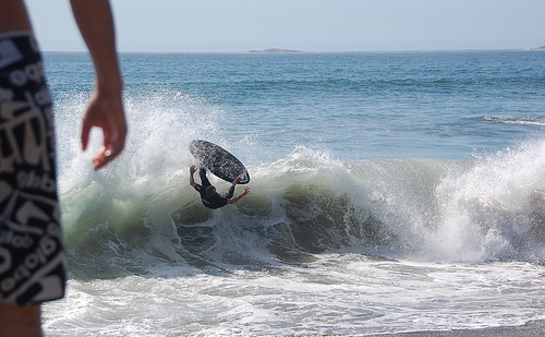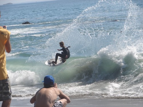 About this time a dilemma started to develop. A long standing mainstay to the cramik is the MegaHeat in which all skimmers ride at one time in one big free-for-all. But, there were simply too many skimmers to hold in one megaheat. Many ideas were discussed, such as having 2 megaheats, or having 2 sets of judges (one on each peak). The decision was haunting me, plus the skim was good and so I tried to put off the decision for as long as we could. Finally, we struck a balance that I think worked pretty well. Colon walked the beach and told everyone whether they were an odd or an even. We decided to run an hour-long megaheat alternating every 10 minutes with odds and evens. This enabled us to cut the field in half, get the riders a break, and also give us a good cheering section. We set no boundaries this event, so everyone was able to skim the entire cove during the heat, but they were warned (Kevlar) that skimming way down the beach was detrimental to their survival out of the megaheat.