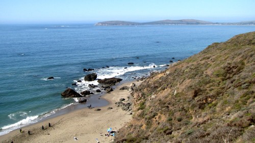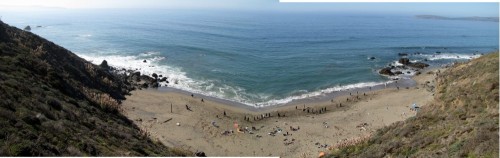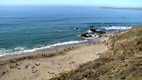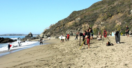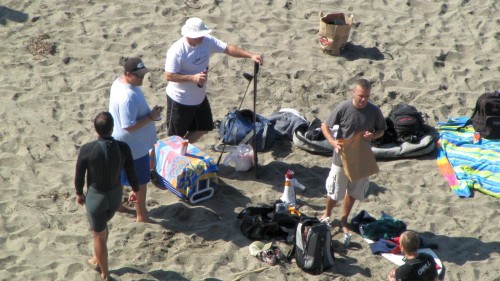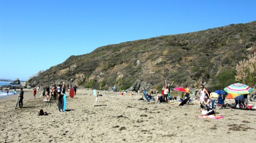 Enough of the background. With the forecast for Saturday getting closer, it was looking hard to believe. A swell was coming, the dub was dying, the heat was increasing. The forecast for Saturday in Bodega was 80 degrees, no fog, no dub. Needless to say, if you’ve lived in the area long enough, you simply don’t believe the weather forecasts. As Fenster and I arrived at around 8:AM at the cove, the fog was way offshore, the air was warm, and you could almost taste victory. After hiking down to the beach, you could also taste defeat. The hike sucks. Not so bad when you’re just walking down with a board and a wetsuit, but when you add a cooler, cameras, a jacket (just in case), a bullhorn, etc., it definitely blows. For those that did not attend last year’s festivities and/or had never been to the cove, it was even worse as the original directions from last year (remember, they had JUST found the place) were outdated and had parking areas designated more than twice as far as the shortcut (sorry!).