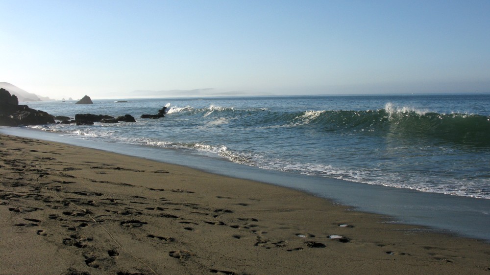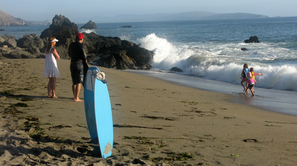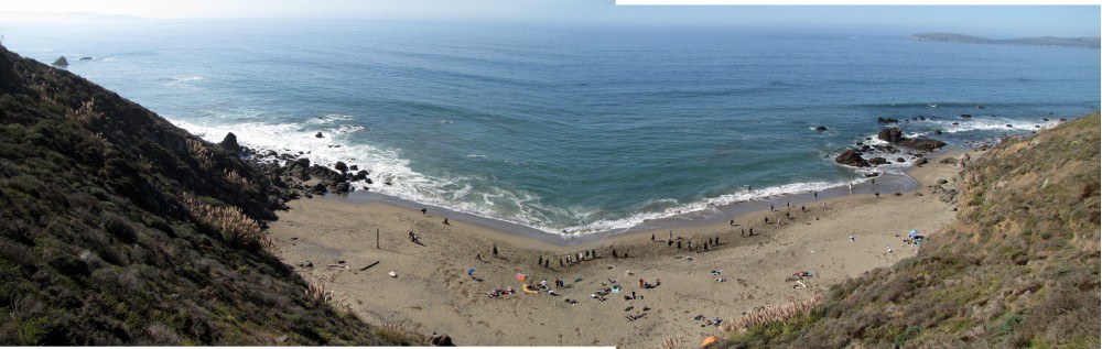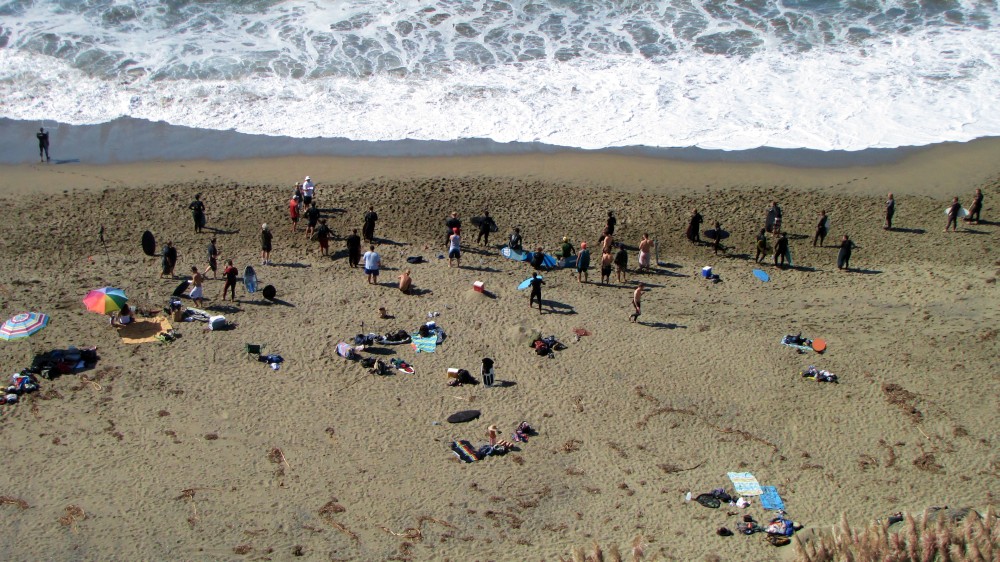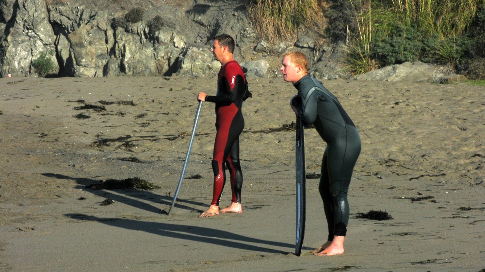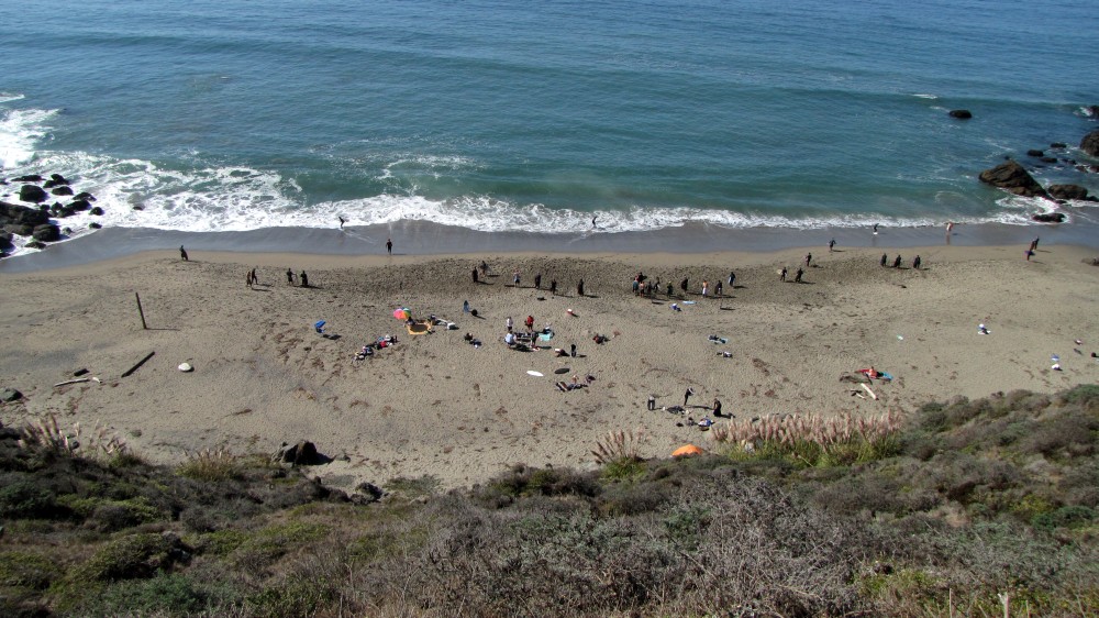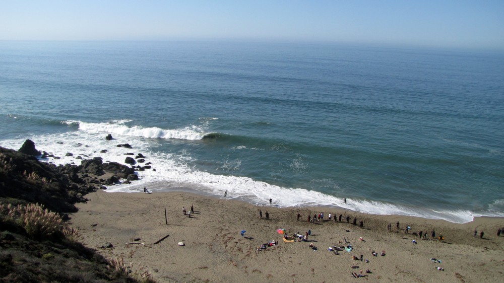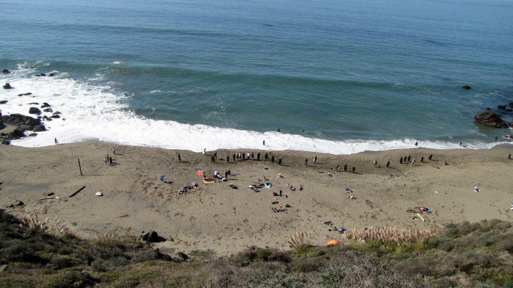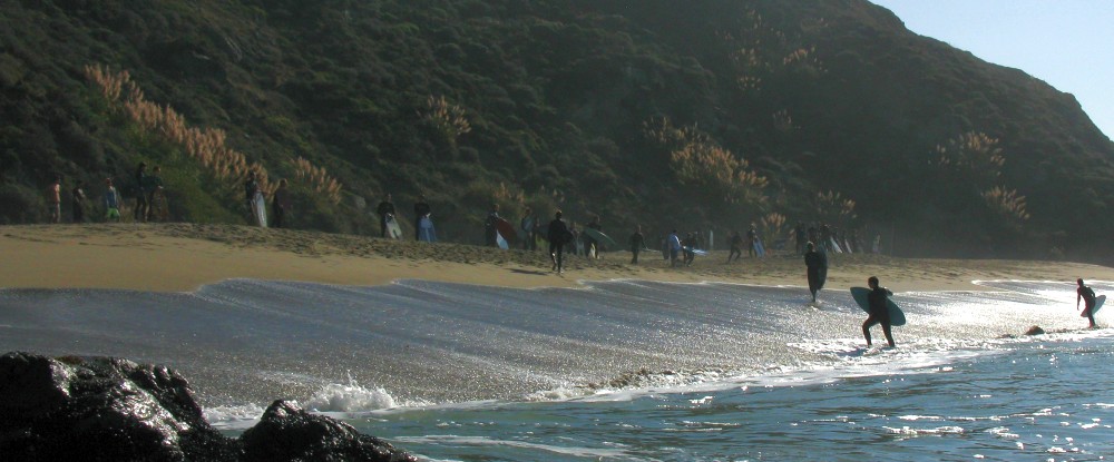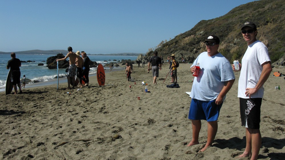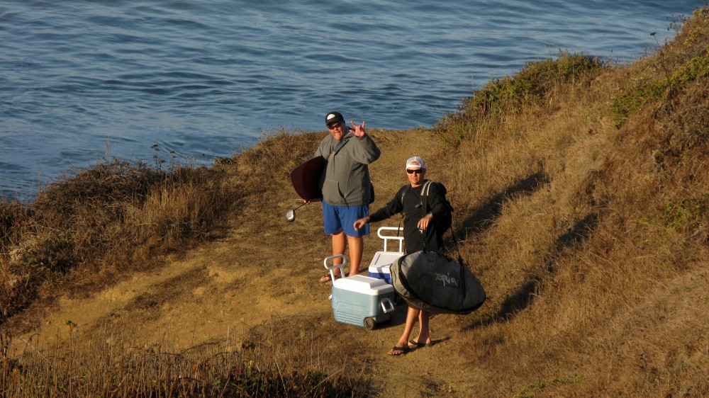 Enough of the background. With the forecast for Saturday getting closer, it was looking hard to believe. A swell was coming, the dub was dying, the heat was increasing. The forecast for Saturday in Bodega was 80 degrees, no fog, no dub. Needless to say, if you’ve lived in the area long enough, you simply don’t believe the weather forecasts. As Fenster and I arrived at around 8:AM at the cove, the fog was way offshore, the air was warm, and you could almost taste victory. After hiking down to the beach, you could also taste defeat. The hike sucks. Not so bad when you’re just walking down with a board and a wetsuit, but when you add a cooler, cameras, a jacket (just in case), a bullhorn, etc., it definitely blows. For those that did not attend last year’s festivities and/or had never been to the cove, it was even worse as the original directions from last year (remember, they had JUST found the place) were outdated and had parking areas designated more than twice as far as the shortcut (sorry!).