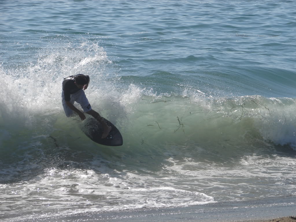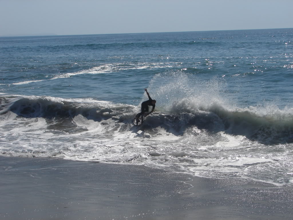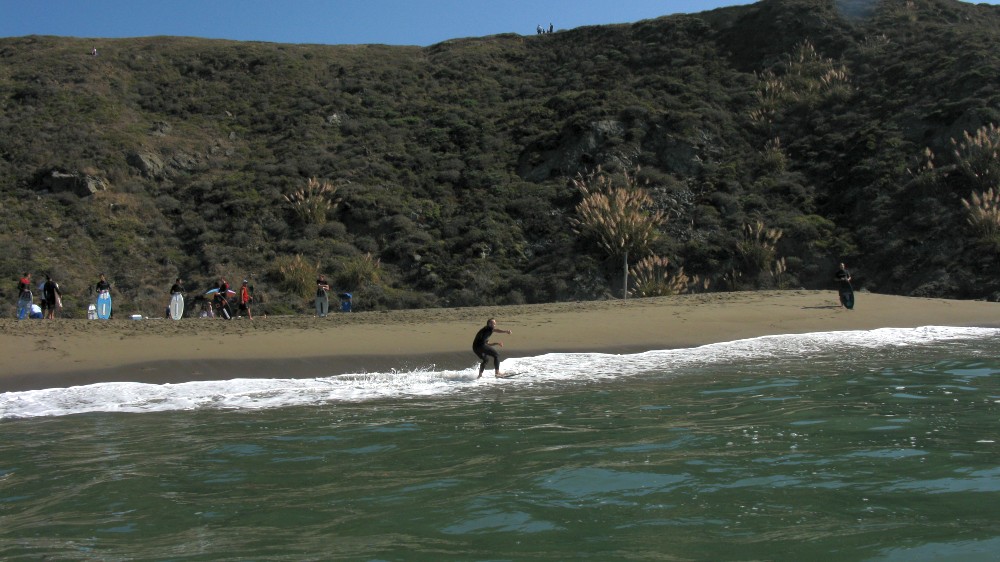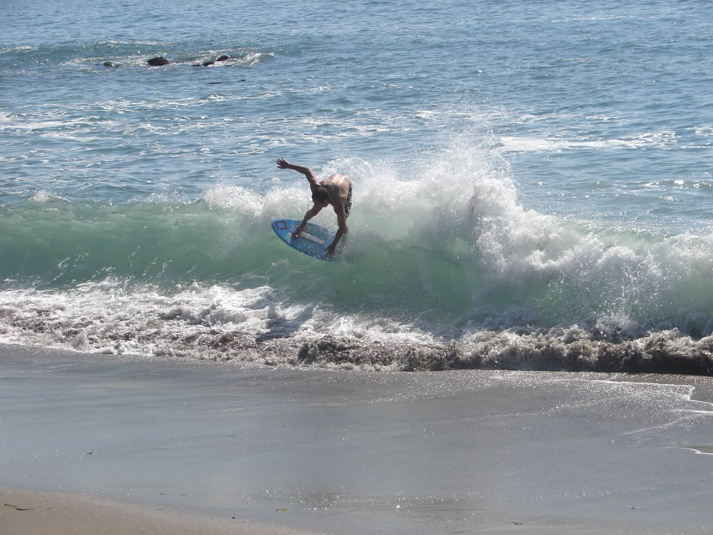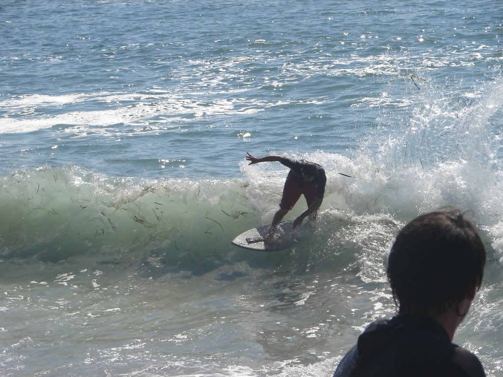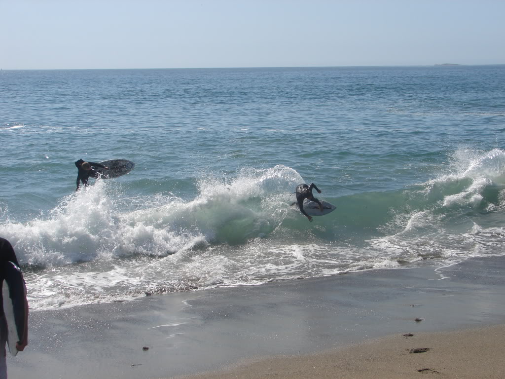 Hiking over the rocks we saw 4 or 5 guys already in the water, among them Kelly, _4255, and VD, already tearing up the glassy onshore conditions. A number of other people were milling about, such as Kevin and Deebo who had also camped down on the beach that night. I decided to snap a couple pics and then couldn’t hold out anymore and had to get in the water. Over the next hour the beach filled up with a steady stream of people. Suddenly The Cove started to look tiny. Luckily, the whole cove was breaking. As Deebo noted, The Cove often has just one side working, but today it was breaking of both ends with peeling wrap coming in for both sides. There were essentially 2 sand peaks on the beach, and by natural order, most of the reggy footers went to the right peak and the goofys to the left with a pretty even spread. There were probably 20 guys on each peak, with sick waves being had at the same time on both. Simultaneous board claps from both sides were often heard and collisions were nearly missed (and sometimes not) when skimmers from each peak went frontside into each other.