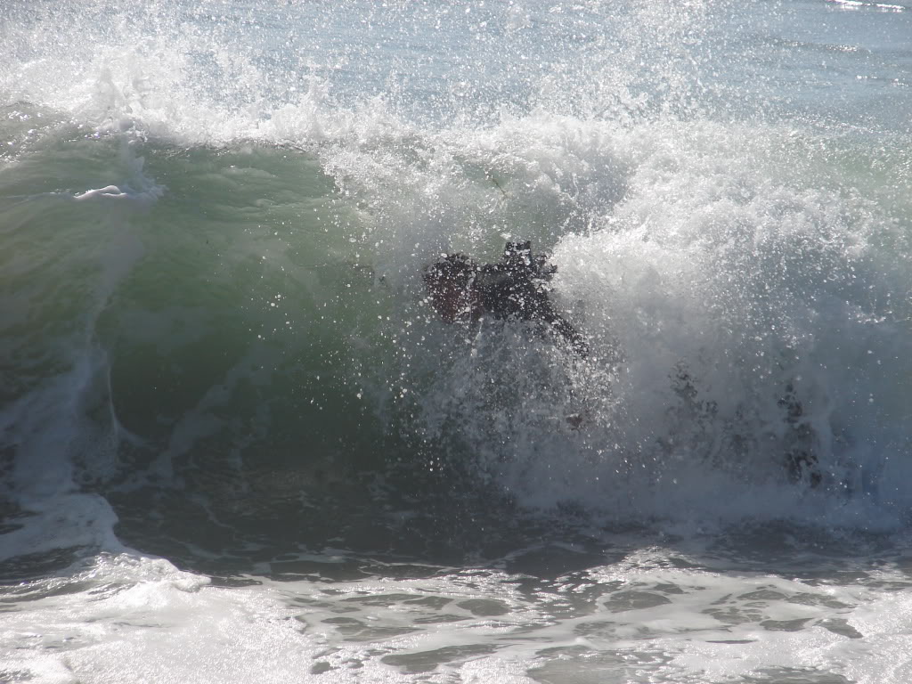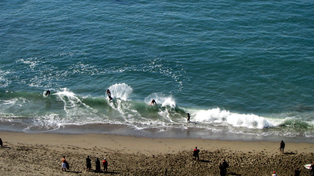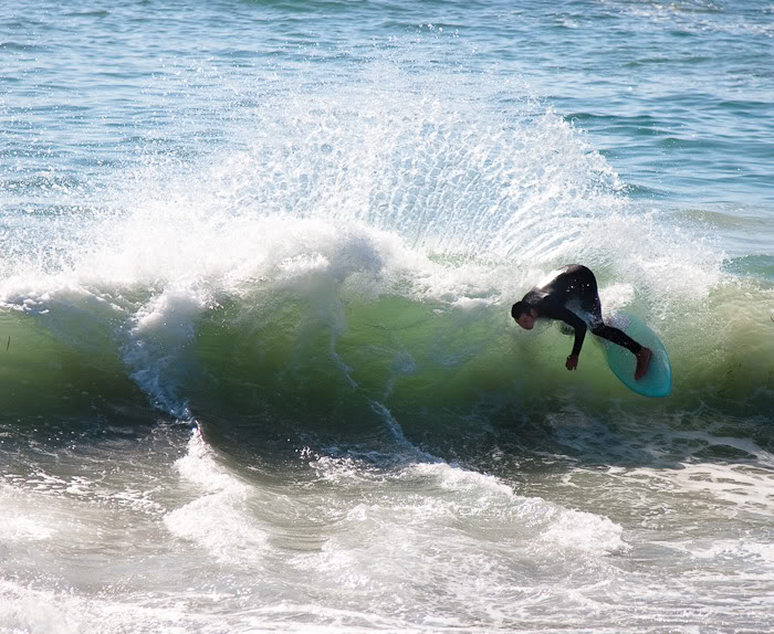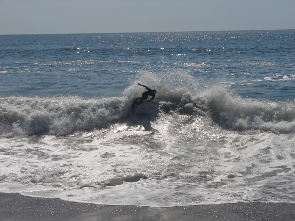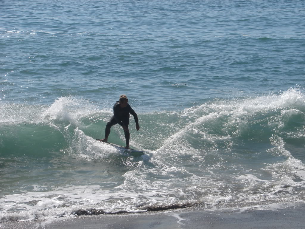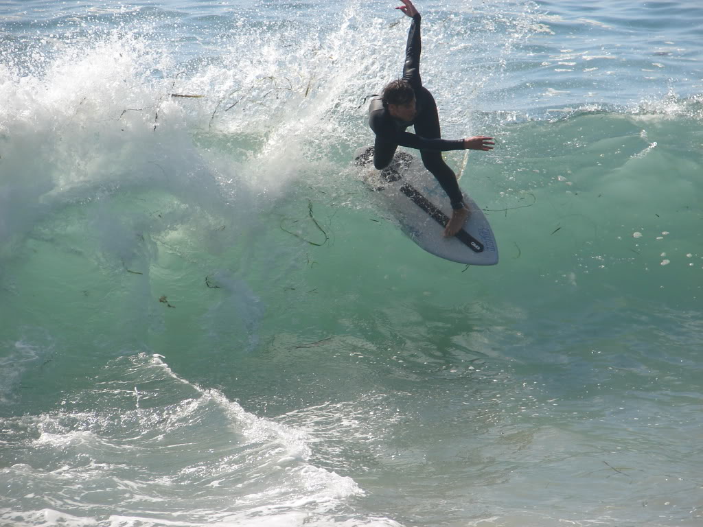 Hiking over the rocks we saw 4 or 5 guys already in the water, among them Kelly, _4255, and VD, already tearing up the glassy onshore conditions. A number of other people were milling about, such as Kevin and Deebo who had also camped down on the beach that night. I decided to snap a couple pics and then couldn’t hold out anymore and had to get in the water. Over the next hour the beach filled up with a steady stream of people. Suddenly The Cove started to look tiny. Luckily, the whole cove was breaking. As Deebo noted, The Cove often has just one side working, but today it was breaking of both ends with peeling wrap coming in for both sides. There were essentially 2 sand peaks on the beach, and by natural order, most of the reggy footers went to the right peak and the goofys to the left with a pretty even spread. There were probably 20 guys on each peak, with sick waves being had at the same time on both. Simultaneous board claps from both sides were often heard and collisions were nearly missed (and sometimes not) when skimmers from each peak went frontside into each other.