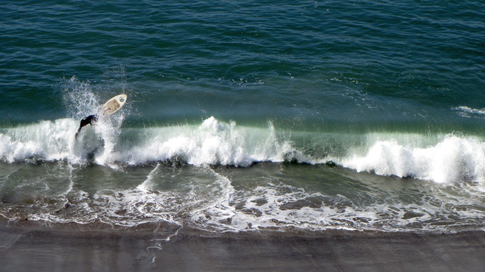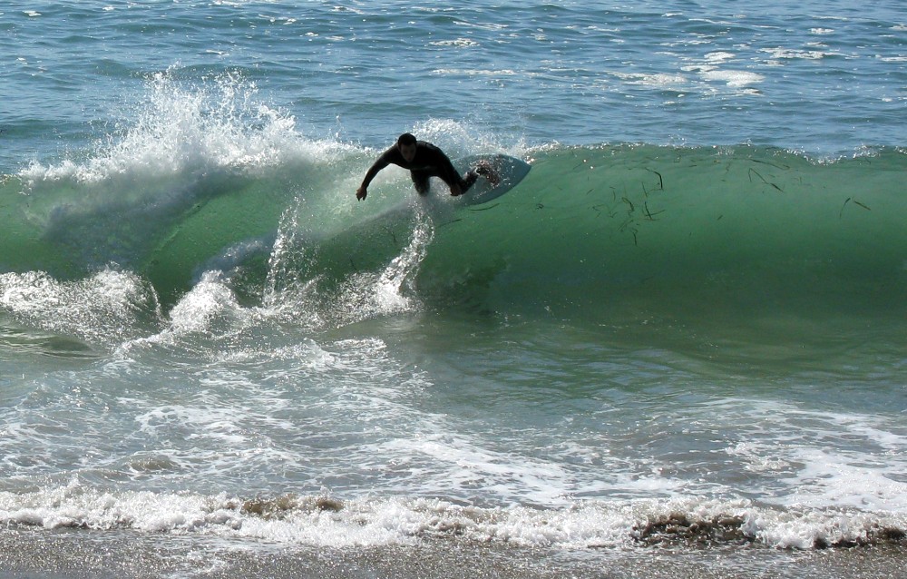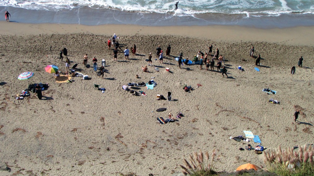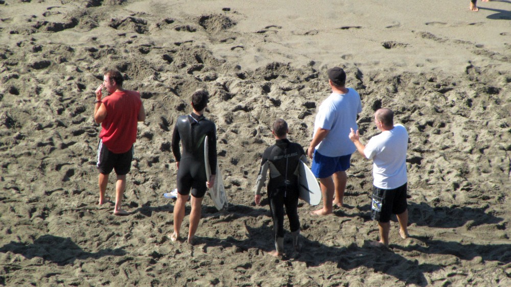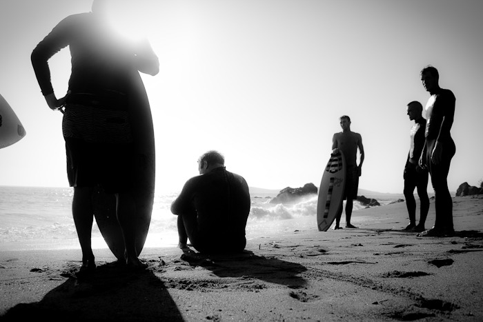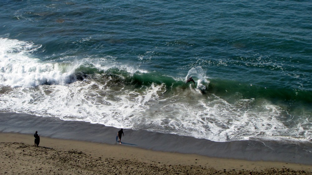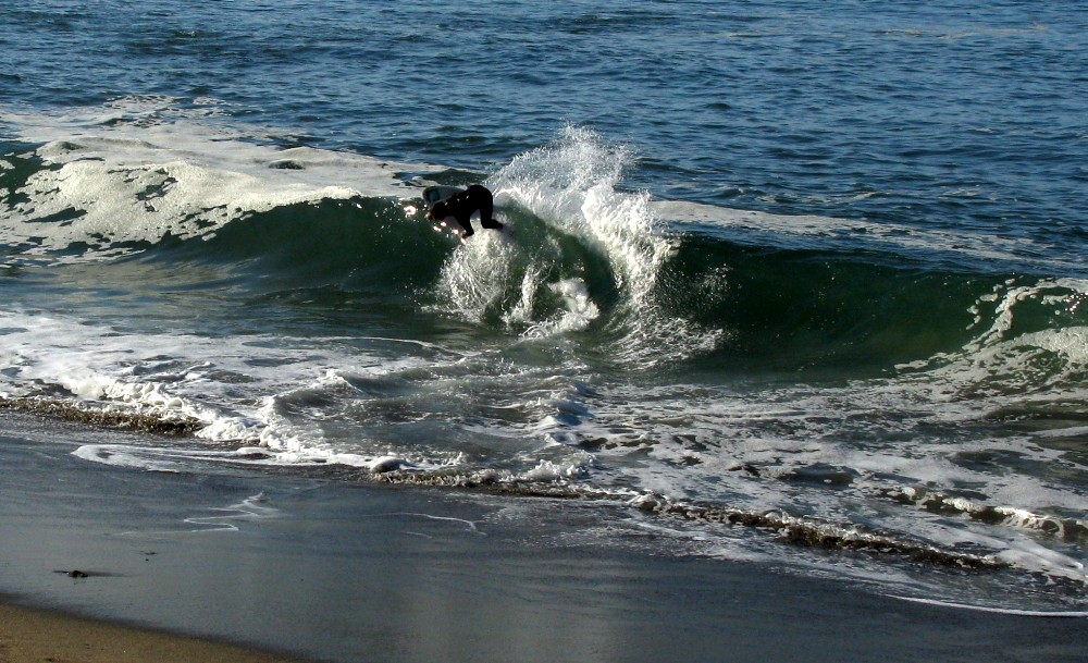Hiking over the rocks we saw 4 or 5 guys already in the water, among them Kelly, _4255, and VD, already tearing up the glassy onshore conditions. A number of other people were milling about, such as Kevin and Deebo who had also camped down on the beach that night. I decided to snap a couple pics and then couldn’t hold out anymore and had to get in the water. Over the next hour the beach filled up with a steady stream of people. Suddenly The Cove started to look tiny. Luckily, the whole cove was breaking. As Deebo noted, The Cove often has just one side working, but today it was breaking of both ends with peeling wrap coming in for both sides. There were essentially 2 sand peaks on the beach, and by natural order, most of the reggy footers went to the right peak and the goofys to the left with a pretty even spread. There were probably 20 guys on each peak, with sick waves being had at the same time on both. Simultaneous board claps from both sides were often heard and collisions were nearly missed (and sometimes not) when skimmers from each peak went frontside into each other.