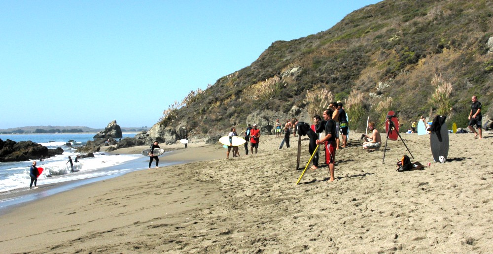 About this time a dilemma started to develop. A long standing mainstay to the cramik is the MegaHeat in which all skimmers ride at one time in one big free-for-all. But, there were simply too many skimmers to hold in one megaheat. Many ideas were discussed, such as having 2 megaheats, or having 2 sets of judges (one on each peak). The decision was haunting me, plus the skim was good and so I tried to put off the decision for as long as we could. Finally, we struck a balance that I think worked pretty well. Colon walked the beach and told everyone whether they were an odd or an even. We decided to run an hour-long megaheat alternating every 10 minutes with odds and evens. This enabled us to cut the field in half, get the riders a break, and also give us a good cheering section. We set no boundaries this event, so everyone was able to skim the entire cove during the heat, but they were warned (Kevlar) that skimming way down the beach was detrimental to their survival out of the megaheat.